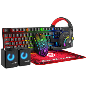 5 מוצר גיימינג בערכה אחת! סט גיימינג ארגונומי הכולל מקלדת RGB, עכבר מקצועי אוזניות ורמקולים ומשטח טעינה בעיצוב אופנתי.